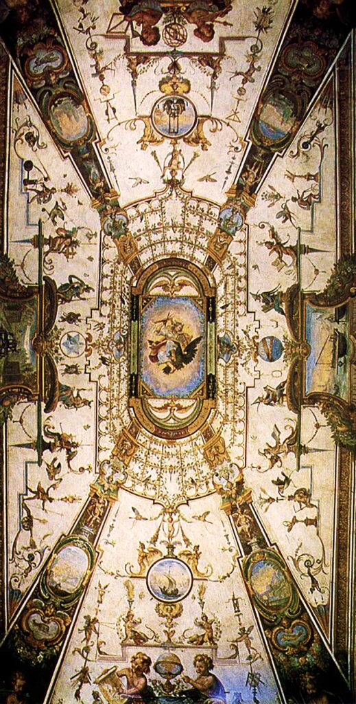 Archimede traccia figure geometriche sul suo corpo mentre fa il bagno poi trova il metodo per smascherare la falsa corona d’oro al sovrano di Siracusa. La manus ferrea, un artiglio meccanico per agganciare e rovesciare le navi romane. Interessante anche la decorazione del soffitto, allegoria della matematica. L’allegoria serve per spiegare dei messaggi nascosti nei dipinti.