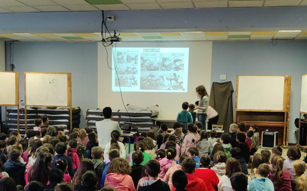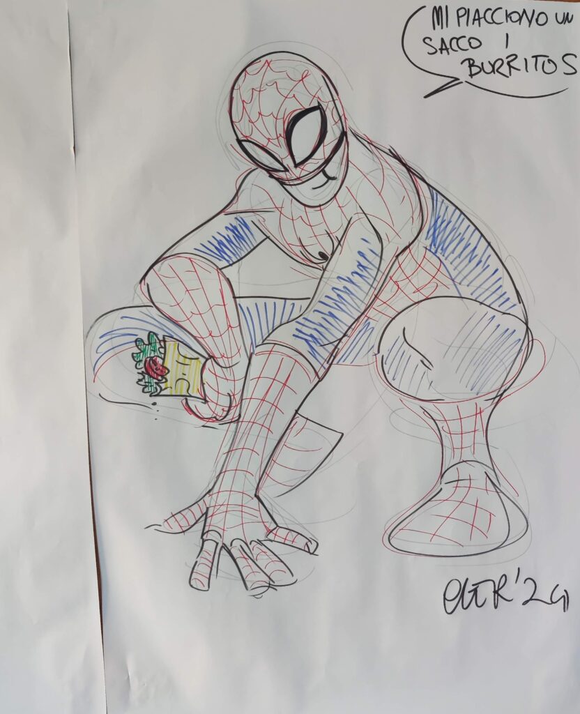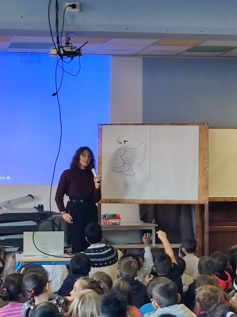 Venerdì mattina abbiamo incontrato una fumettista Chiara Milano, ci ha disegnato su dei grandi fogli TOPOLINO, PAPERINIK e SPIDER MAN. Infine ha lanciato una challenge, si trattava di una pagina di un fumetto con due vignette vuote, e tutte le classi dovevano scoprire cosa dicevano i personaggi.