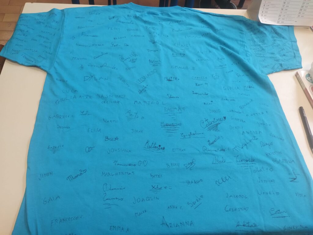 Nelle settimane precedenti, la maestra ha fatto firmare la maglietta a tutti i bambini della scuola agli insegnanti e ai collaboratori scolastici