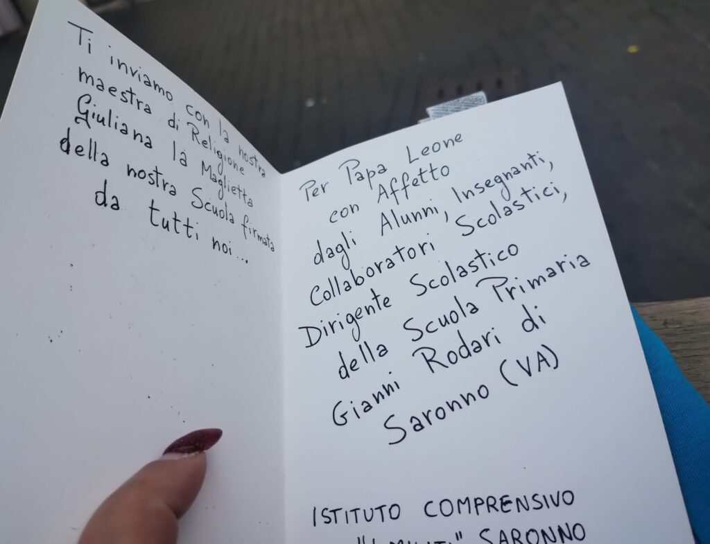 “Ho voluto donare la maglietta della nostra scuola firmata da tutti noi cosi come avevamo fatto lo scorso 4 gennaio 2025 con Papa Francesco è stato un momento bello ed emozionante”