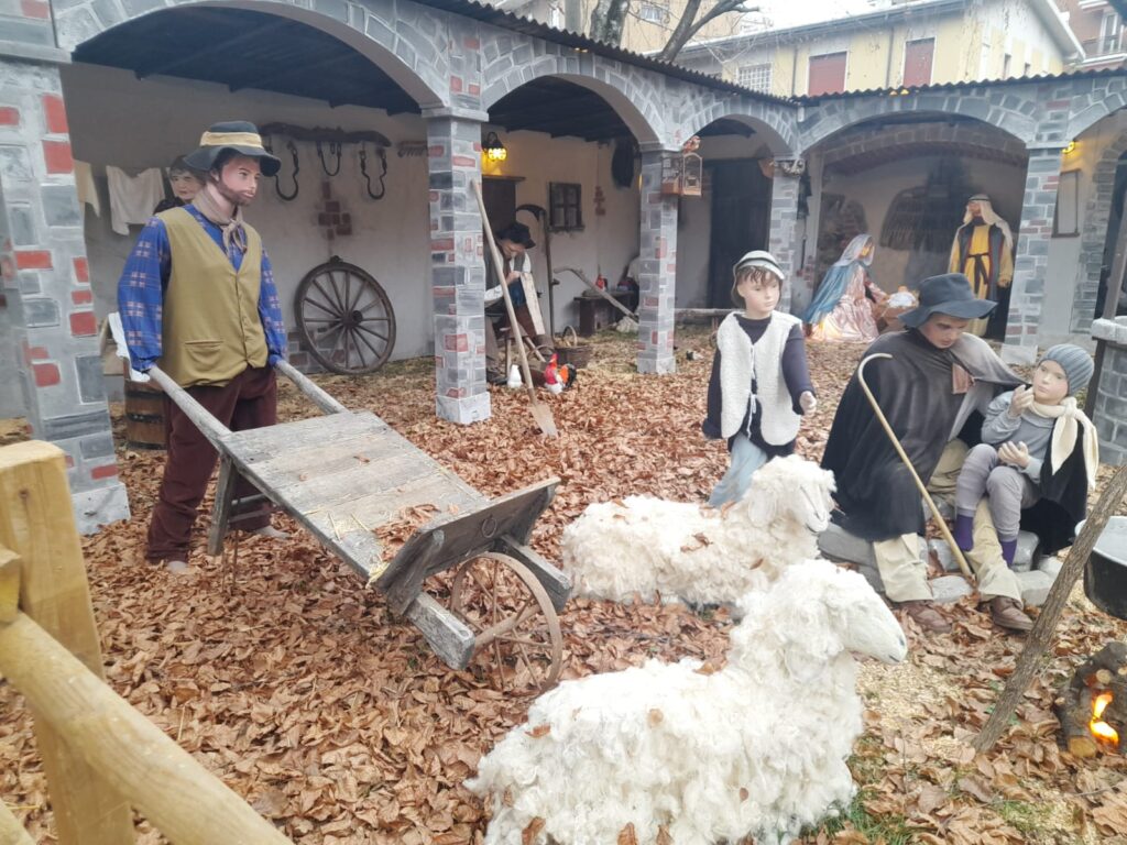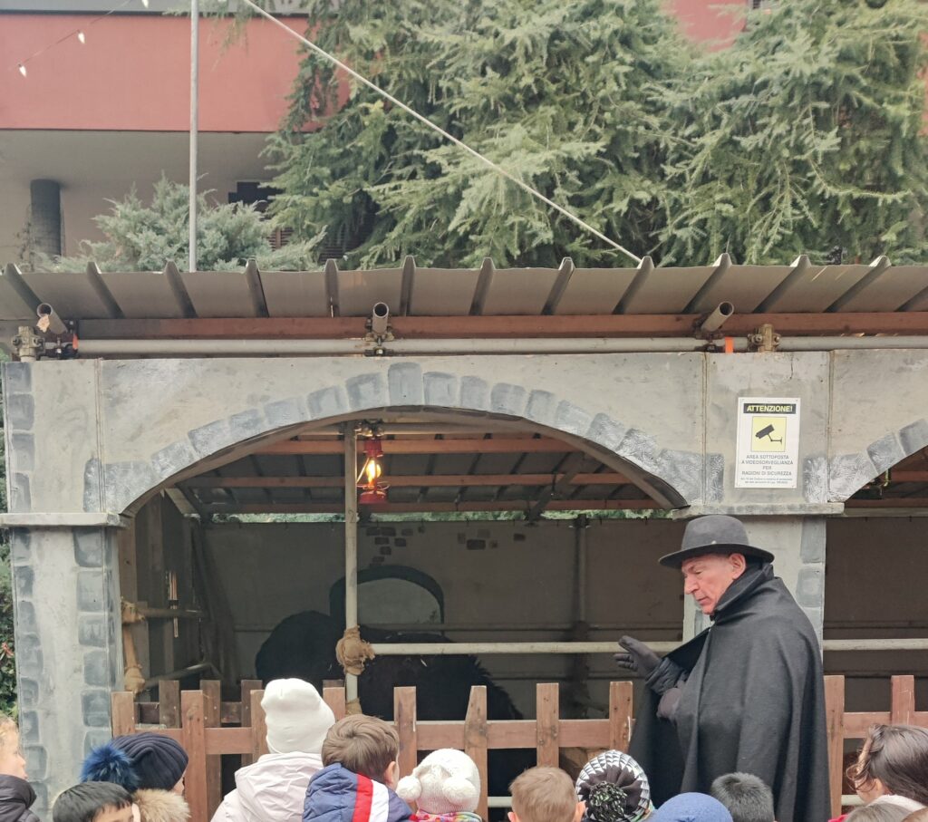 Una volta usciti abbiamo osservato il presepe e abbiamo visto gli animali tra cui una mucca incinta, pecore e asini. Poi abbiamo ammirato le case e gli oggetti antichi tra cui pentole, coltelli, forni.